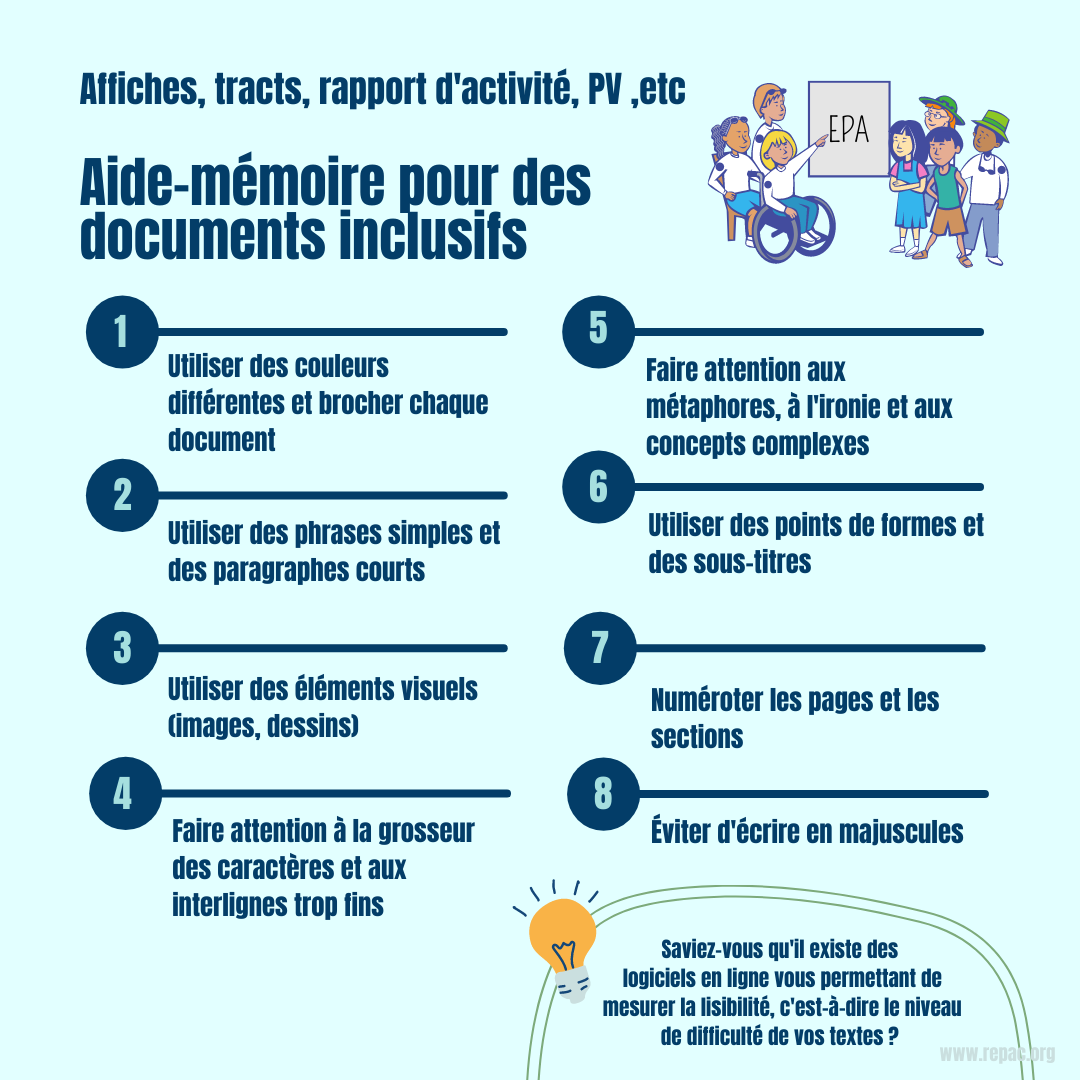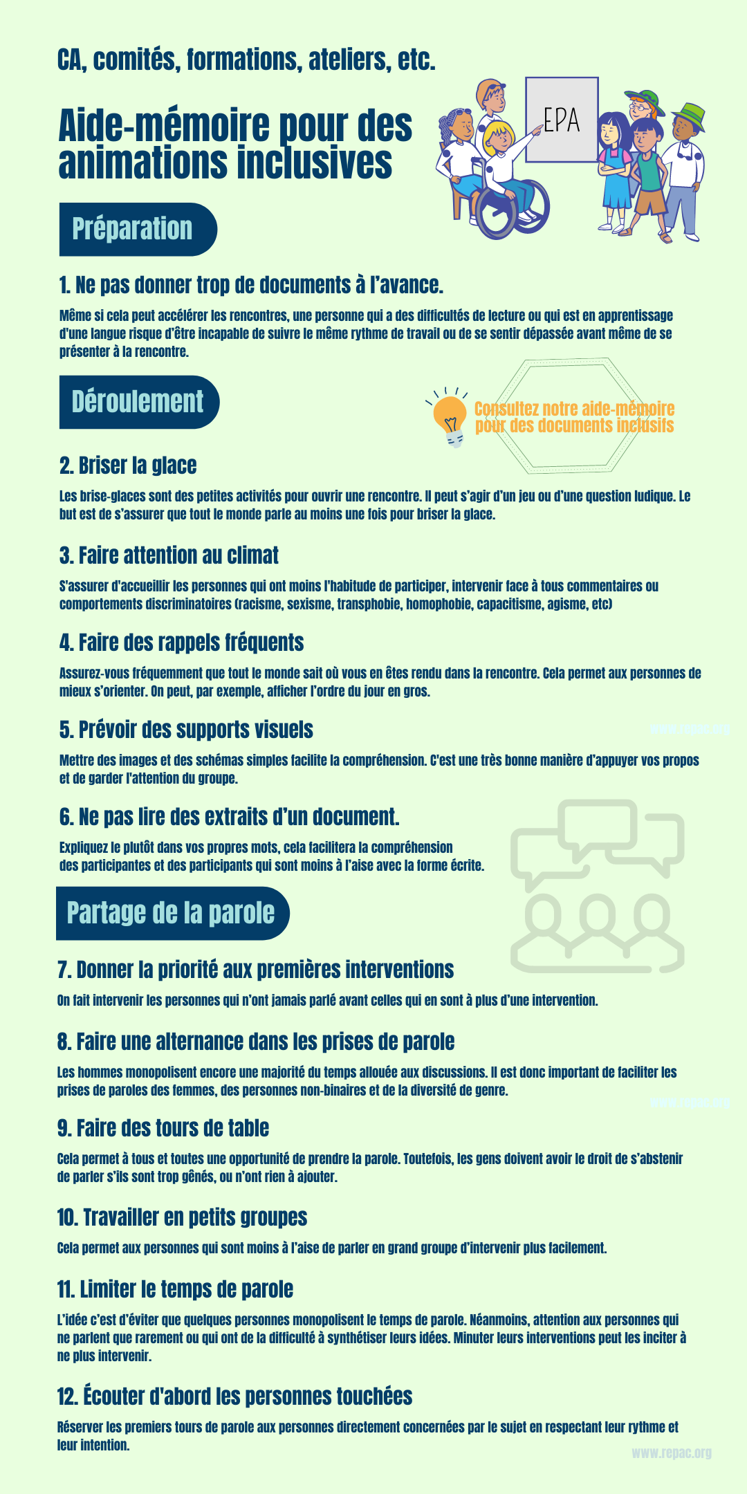 Voici deux aide-mémoires qui s’adressent aux groupes communautaires ou tout autre groupe soucieux d’animer des rencontres et de préparer de la documentation de façon inclusive.