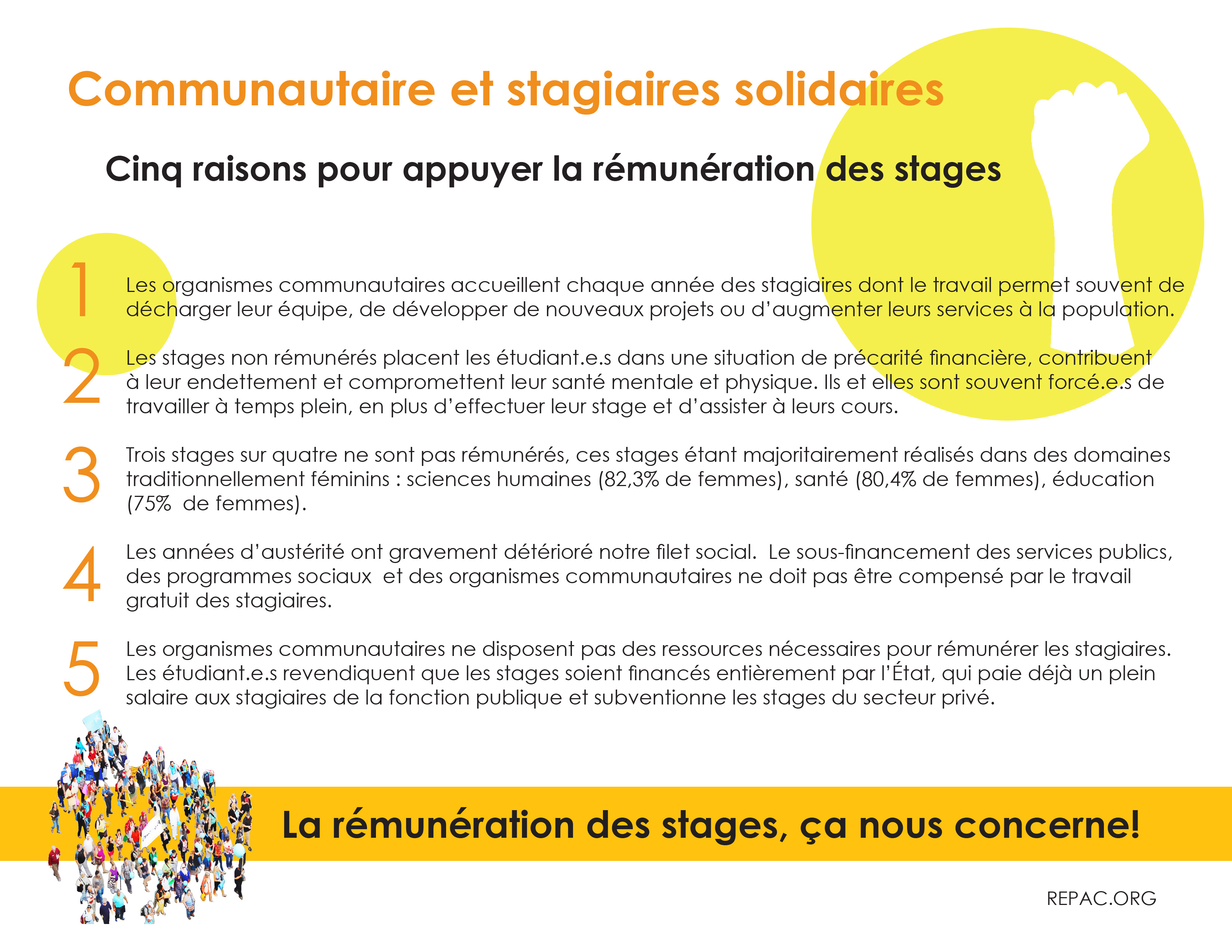 Le Regroupement d’éducation populaire en action communautaire des régions de Québec et Chaudière-Appalaches (REPAC 03-12) appuie la lutte menée par les étudiant.e.s pour faire reconnaitre le travail qu’ils et elles effectuent lors de leurs stages.