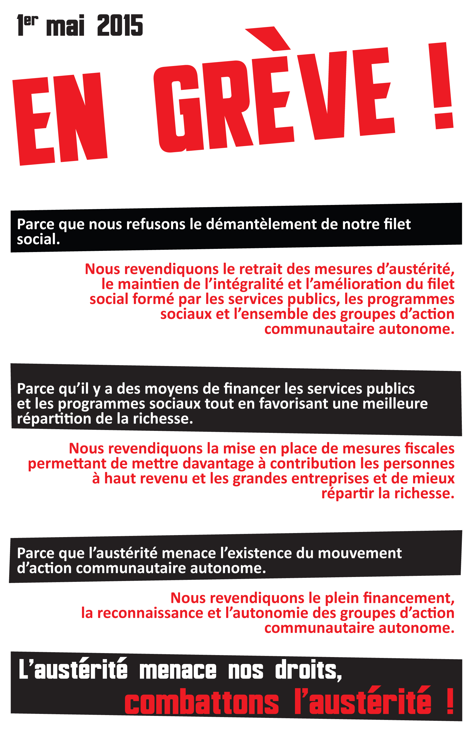 Affiche en greveQuébec, le 30 avril 2015- Le Regroupement d’éducation populaire des régions de Québec et Chaudière-Appalaches, à l’instar de près de 800 groupes sociaux, sera en grève demain, le 1er mai. Le RÉPAC et 29 de ses groupes membres fermeront leur bureau et seront en action toute la journée afin de protester contre le démantèlement de nos services publics, de revendiquer le retrait des mesures d’austérité et la mise en place de mesures fiscales permettant une meilleure répartition de la richesse. Les organismes demandent également un meilleur financement, la reconnaissance et l’autonomie de l’action communautaire autonome. Fermetures de bureau, piquetage, actions, zones de grève, manifestation, tout est en place pour faire de cette journée un moment historique !