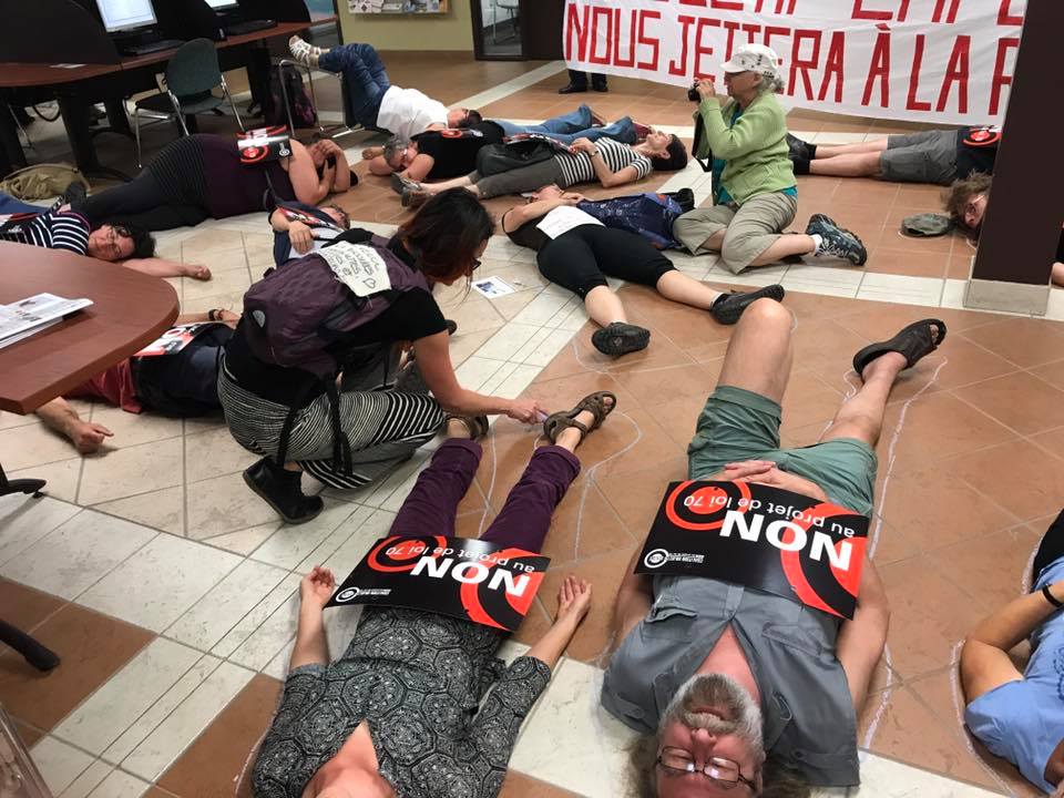 Québec, le 30 août 2017 – À quelques jours de la fin de la période de consultation sur les règlements du nouveau programme Objectif emploi (PL70), la Coalition régionale contre PL70, composée des groupes de défense des droits des personnes assistées sociales des régions de Québec et Chaudière-Appalaches et leurs allié-e-s, est allée livrer un message au Centre local d’emploi des Quartiers Historiques sous forme de « die-in ».