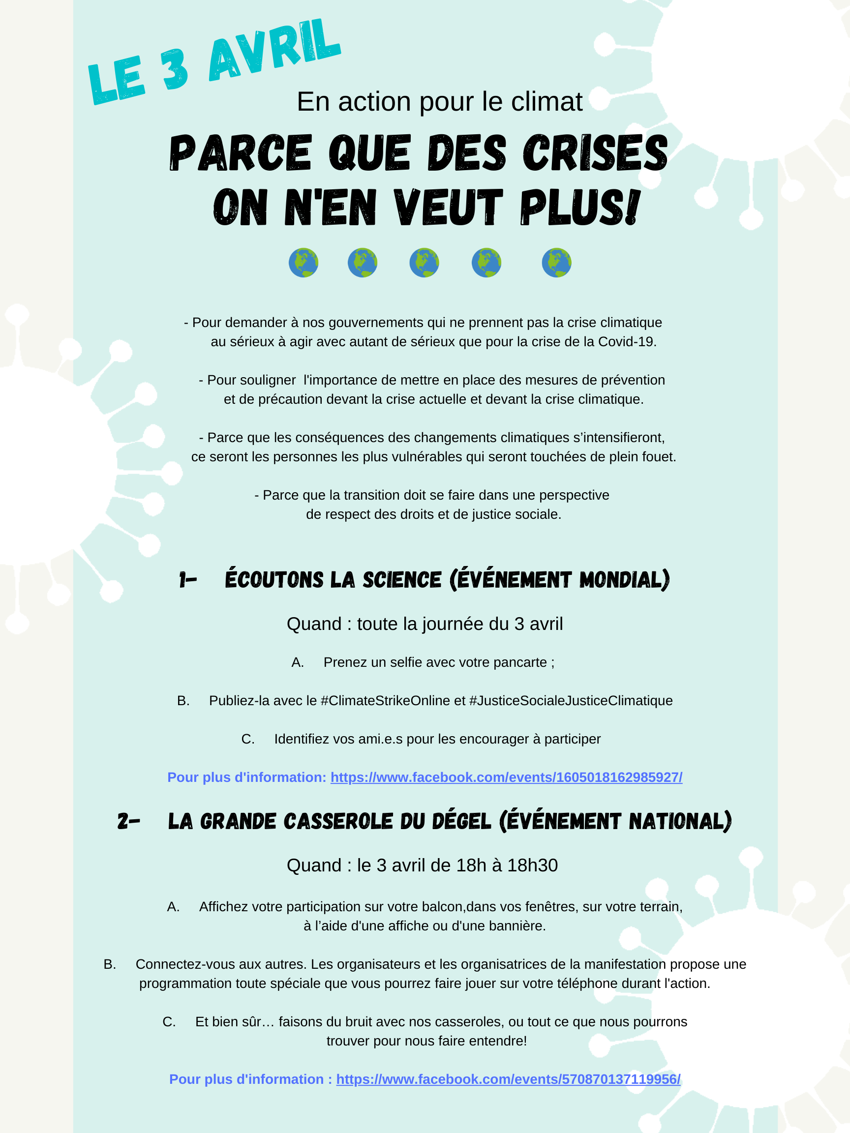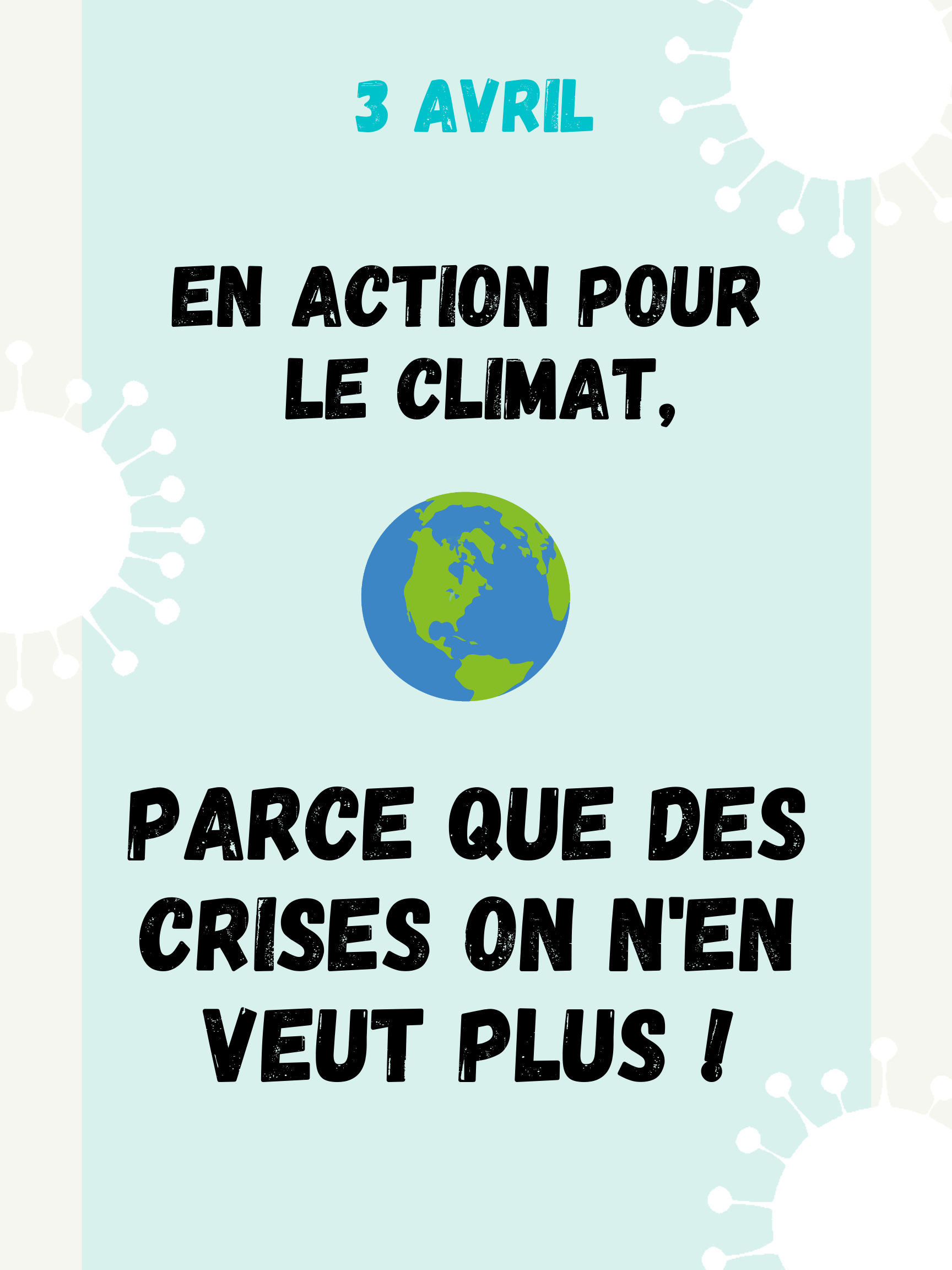 Le 3 avril : En action pour le climat, PARCE QUE DES CRISES ON N’EN VEUT PLUS!