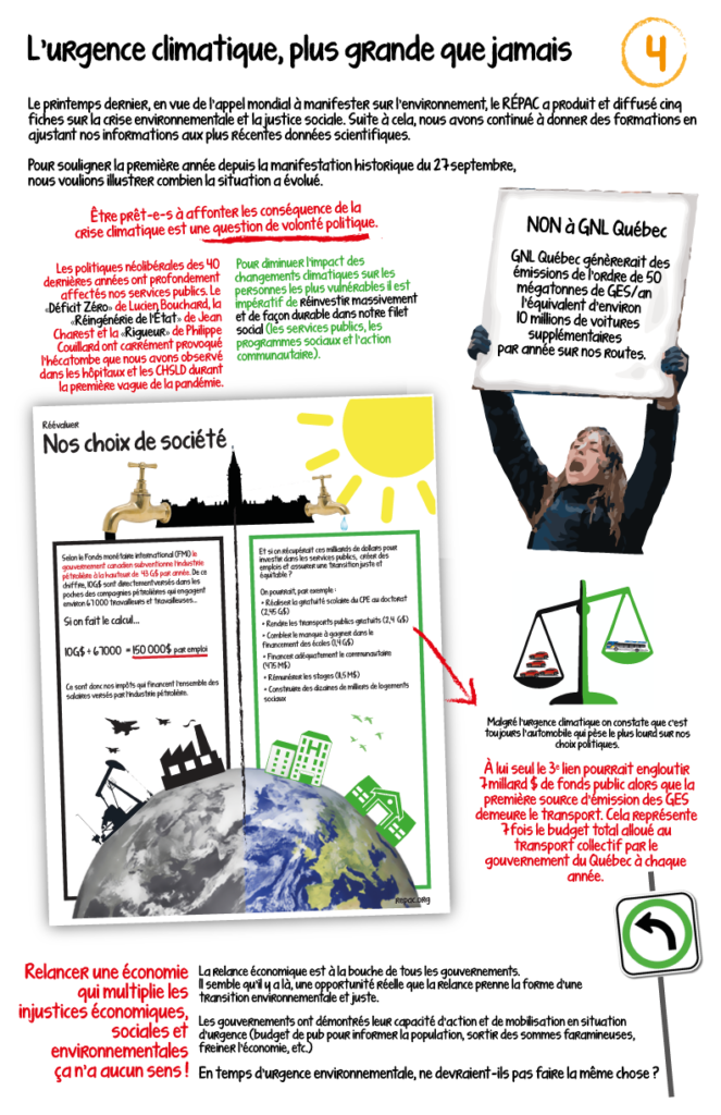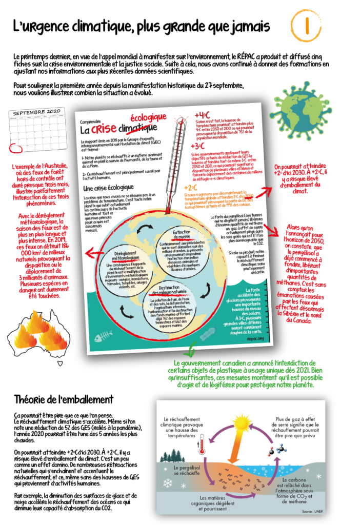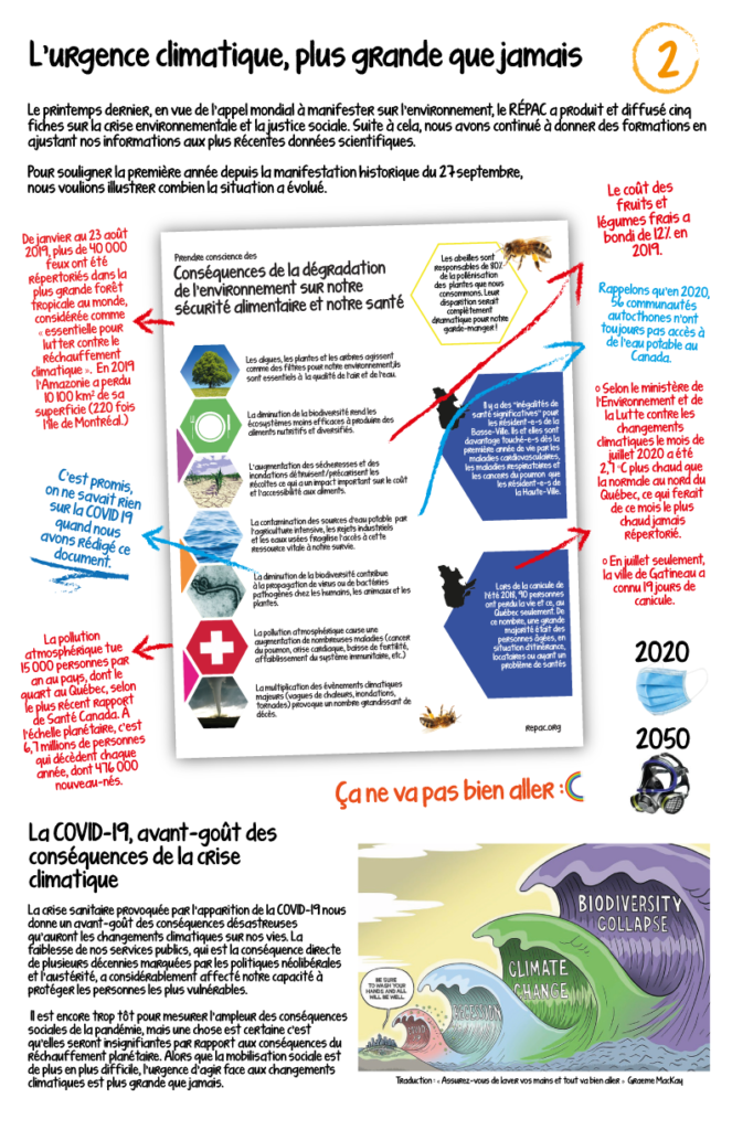 Le printemps dernier, en vue de l’appel mondial à manifester sur l’environnement, le RÉPAC a produit et diffusé cinq fiches sur la crise environnementale et la justice sociale. Suite à cela, nous avons continué à donner des formations en ajustant nos informations aux plus récentes données scientifiques.