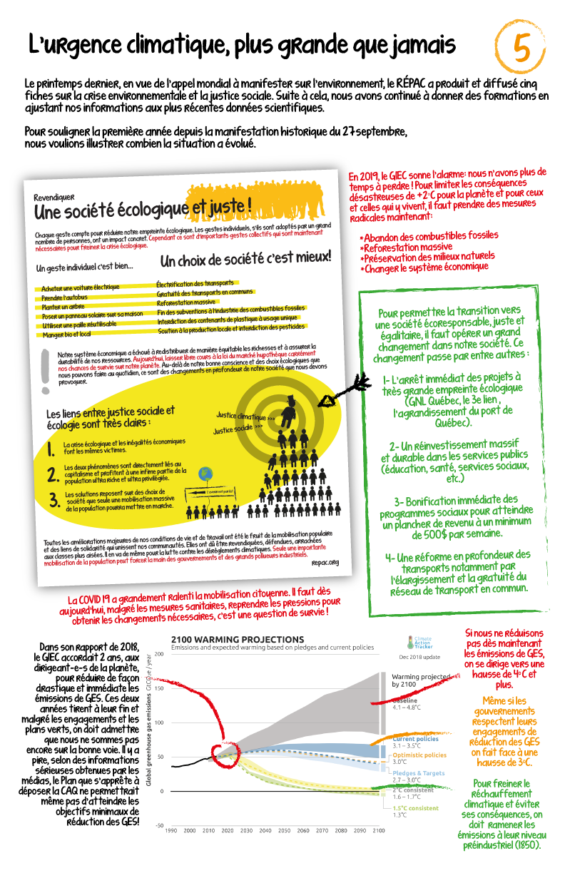 Le printemps dernier, en vue de l’appel mondial à manifester sur l’environnement, le RÉPAC a produit et diffusé cinq fiches sur la crise environnementale et la justice sociale. Suite à cela, nous avons continué à donner des formations en ajustant nos informations aux plus récentes données scientifiques.