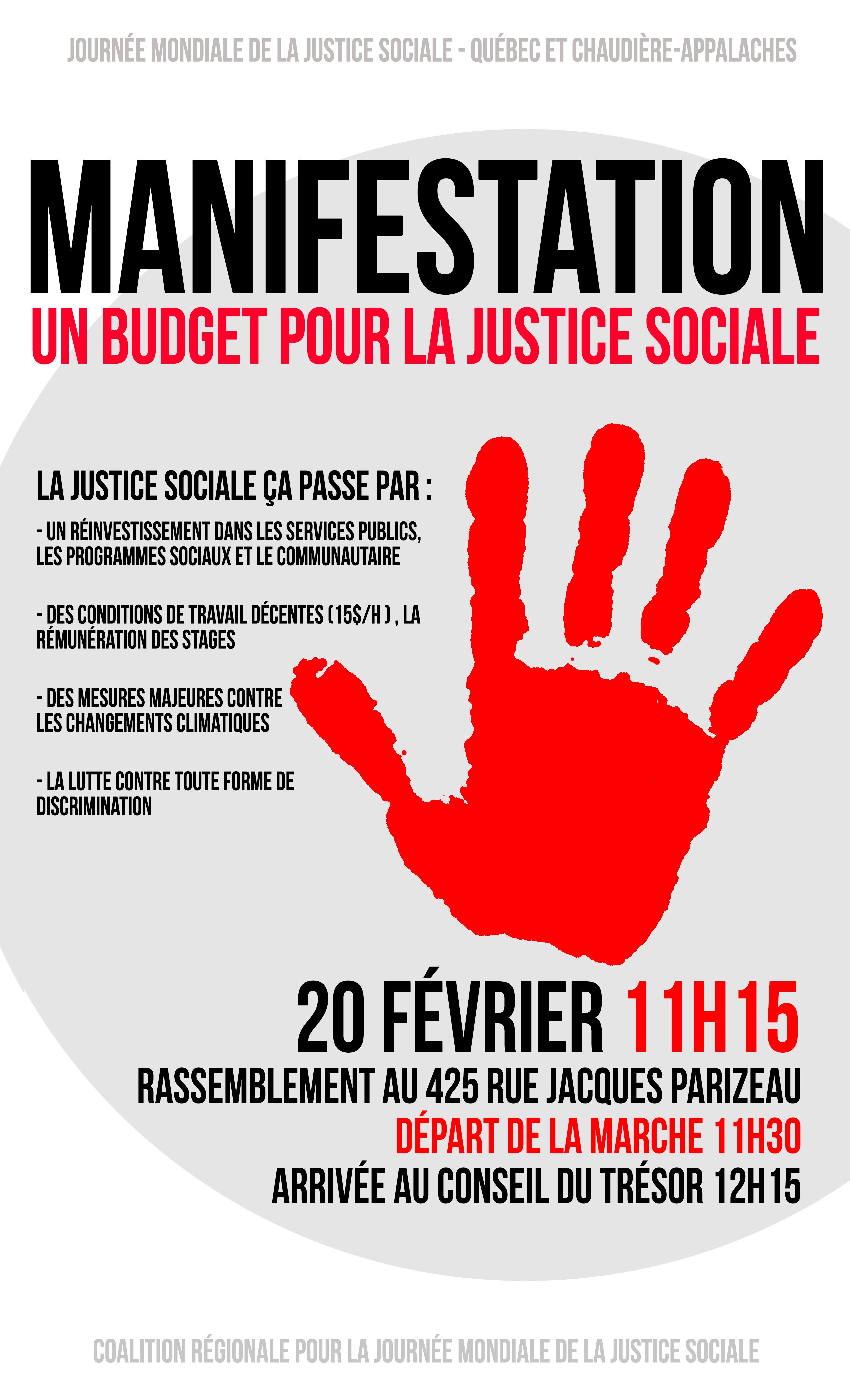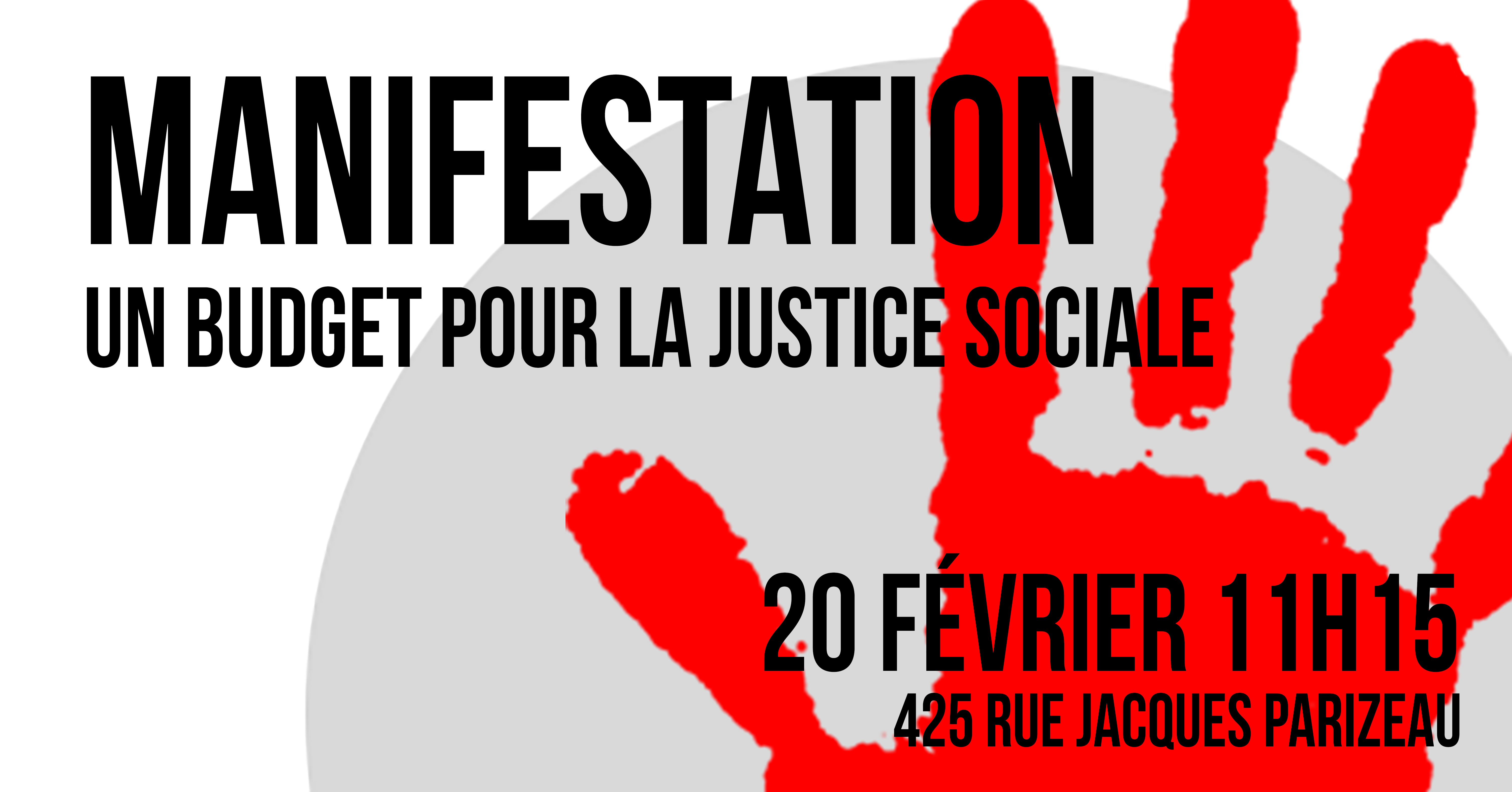 La population est invitée à une manifestation régionale le 20 février prochain. Exigeons que le premier budget du gouvernement de François Legault soit consacré à la justice sociale.