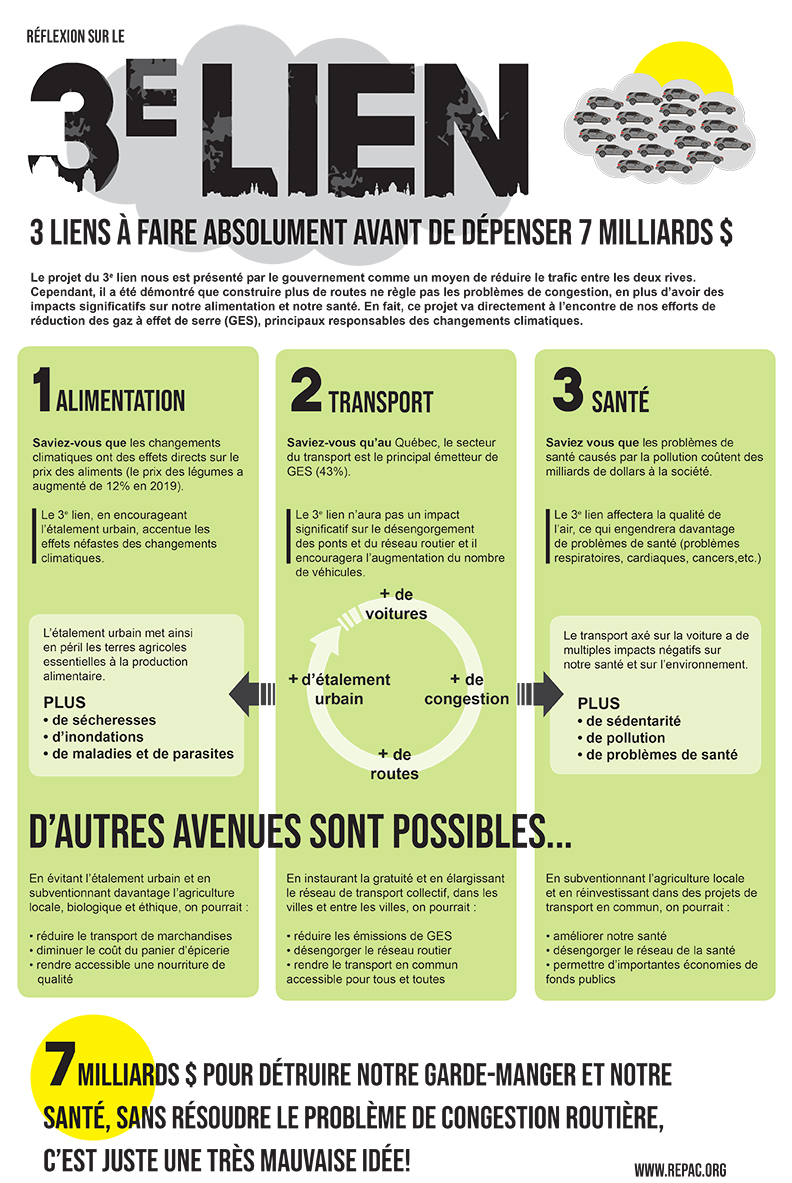 Réflexion sur le 3e lien Posted on janvier 16, 2020 by repacusr Voici un outil pour nourrir les réflexions à propos des liens qu’il est essentiel de tracer entre le projet du 3e lien et l’urgence climatique et des impacts sur nos vies qui en découlent. Bonne lecture !