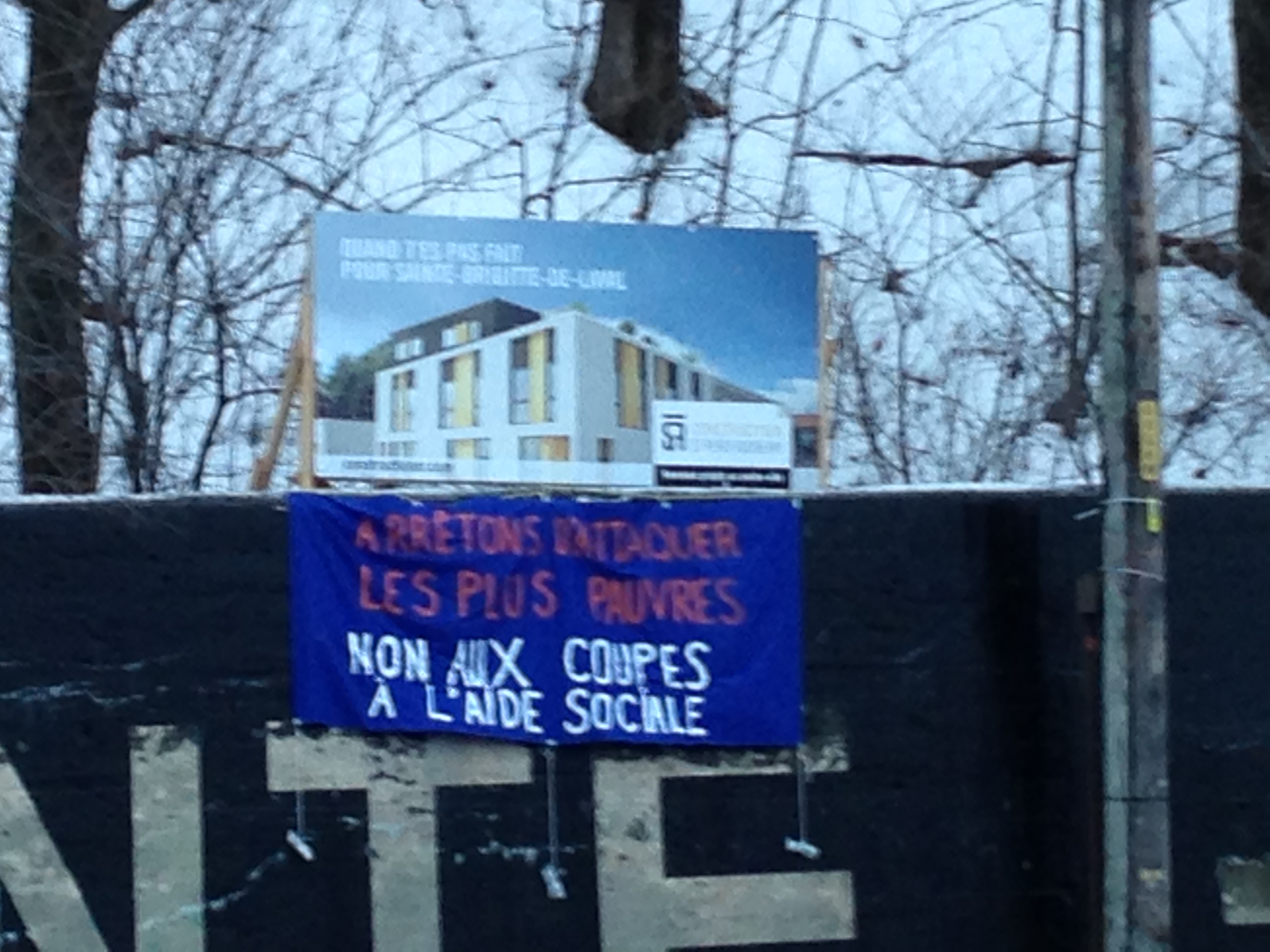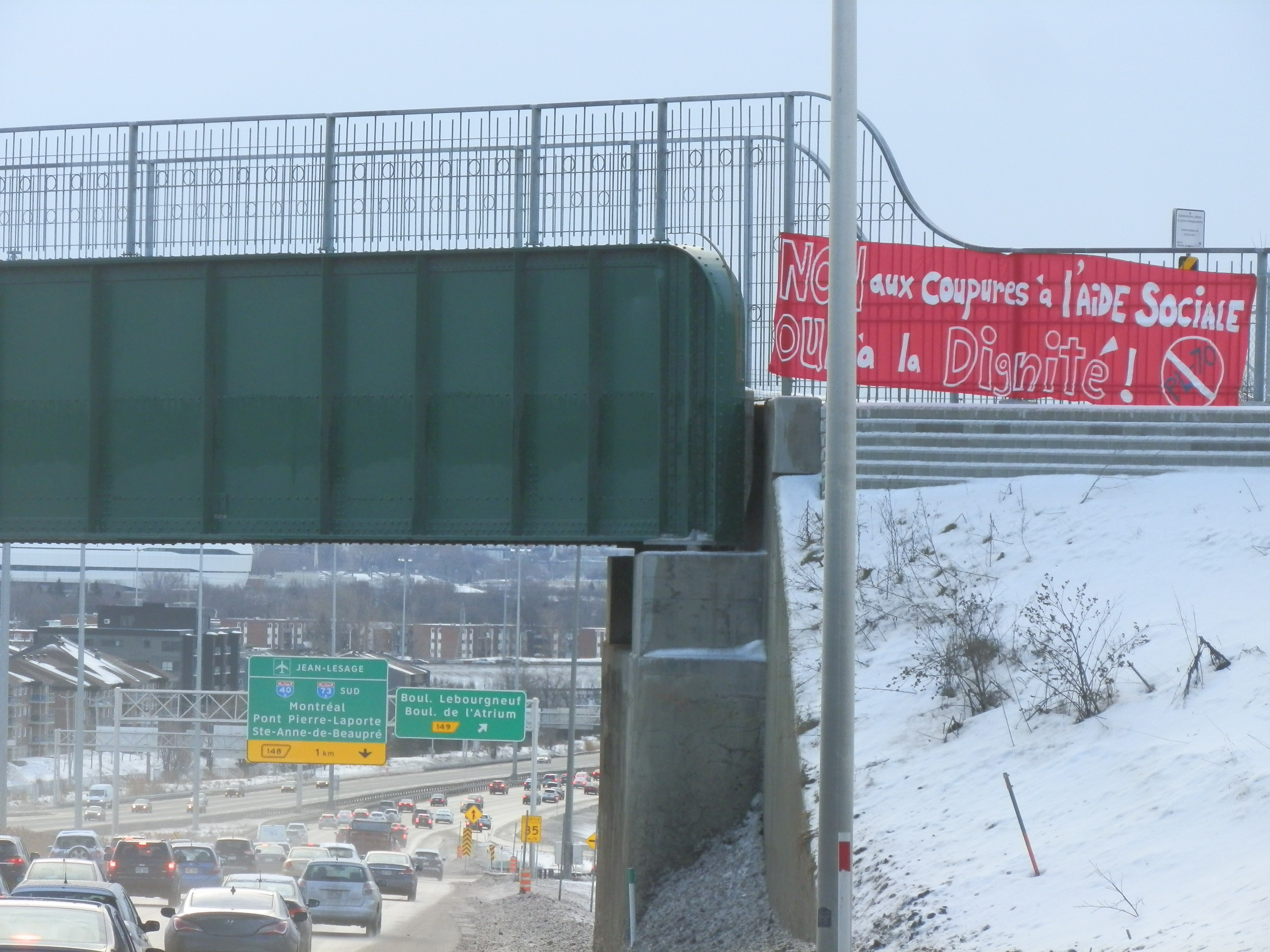 Québec, le 27 janvier 2016 – Des groupes communautaires des régions de Québec et Chaudière-Appalaches ont protesté ce matin contre le projet de loi 70 en installant des bannières sur des axes routiers de Québec (voir photos ci-jointes). Les groupes dénoncent avec force l’imposition de mesures d’employabilité obligatoires assorties de pénalités financières visant les personnes considérées « aptes à l’emploi » qui font une première demande d’aide sociale. Les expériences passées démontrent l’inefficacité de telles mesures. Les personnes vulnérables qui font une première demande d’aide sociale ont besoin de support et de temps pour reprendre le contrôle de leur vie. En leur forçant la main et en les appauvrissant davantage le ministre Hamad risque surtout d’aggraver la situation en les jetant littéralement à la rue.
